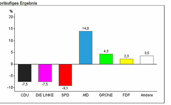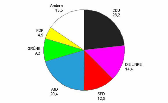 Trotz der Verluste hat die CDU insgesamt noch die meisten Wählerstimmen erhalten, auf dem zweiten Platz liegt die AfD, drittstärkste Partei wurde die DIE LINKE. Allerdings sind die Ergebnisse von Stadt zu Stadt sehr unterschiedlich. Eine Übersicht zu allen Landkreisen und den kreisfreien Städte Magdeburg, Halle (Saale) und Dessau-Roßlau finden Sie auf der Internetseite des Statistischen Landesamtes.