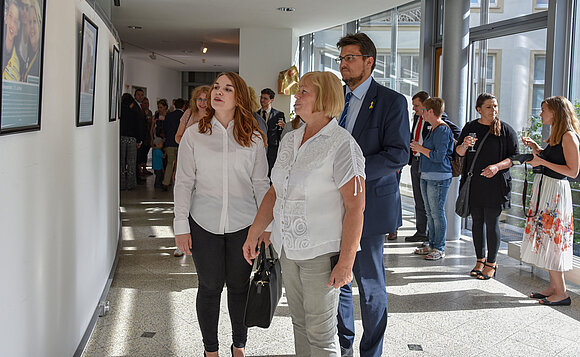Anmerkung:Beim Ausstellungsrundgang (v.l.n.r.): Melanie Koch (Jugend-DRK-Landessverband Sachsen-Anhalt), Landtagspräsidentin Gabriele Brakebusch und Landtagsabgeordneter Tobias Krull. Foto: Stefanie Böhme