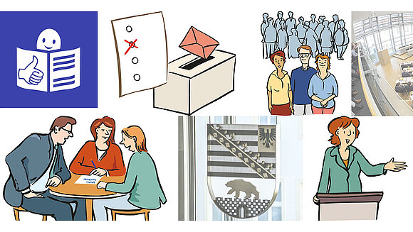 Der Landtag bietet auch Informationen in Leichter Sprache an. Zu dem Angebot gelangen Sie über das Weltkugel-Symbol auf der Startseite unseres Internetangebots, ganz oben rechts. Illustrationen: Reinhild Kassing; Fotos: Landtag