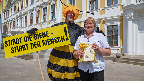 Bienenaktivist Gerry Weber aus Burg überreichte Landtagspräsidentin Gabriele Brakebusch ein Buch zur Geschichte der Bienen und bat sie, das Thema Bienenschutz erneut in den Landtag zu tragen. Foto Stefanie Böhme