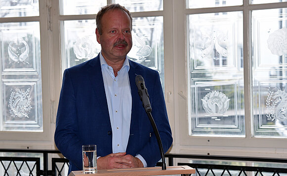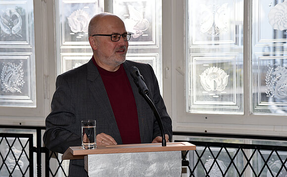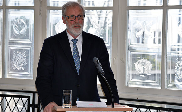 Anmerkung:Kulturminister Rainer Robra während der Eröffnung der Ausstellung zum Bauhaus in Tel Aviv. Foto: Stefan Müller