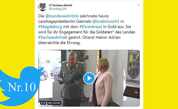 Anmerkung:Im August 2019 erhält Landtagspräsidentin Gabriele Brakebusch das Ehrenkreuz der Bundeswehr und die Twitter-Gemeinde ist begeistert. Das bedeutet Platz 10 in unserem „Twitter-Best-Of“.