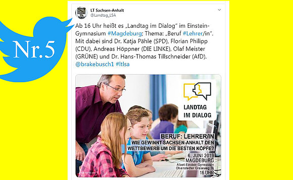 Anmerkung:In der Reihe „Landtag im Dialog“ fuhr der Landtag kreuz und quer durch Sachsen-Anhalt, um mit den Bürgern ins Gespräch zu kommen. Eine Ankündigung zu einer Diskussion zum Thema „Lehrermangel“ im Juni fand großen Anklang bei der Twitter-Gemeinde.