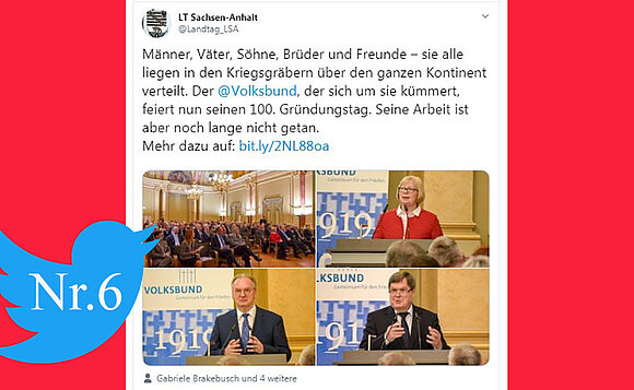 Anmerkung:Platz 6 geht in diesem Jahr an einen Tweet mit 30 Likes über die Veranstaltung zum 100. Gründungsjubiläum des Volksbundes Deutsche Kriegsgräberfürsorge.