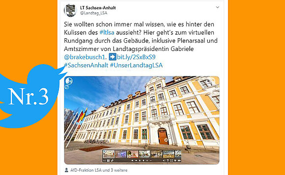 Anmerkung:Eigentlich ein einfacher Service-Tweet im grauen Februar entpuppte sich der Hinweis auf unseren virtuellen Rundgang durch das Landtagsgebäude als sehr beliebt. Ergebnis: 23 Likes, 12 Retweets und Platz 3 in unserem „Twitter-Best-Of“.