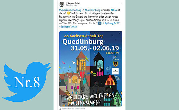 Anmerkung:Auf großes Interesse stieß auch die Ankündigung zum Sachsen-Anhalt-Tag 2019 in Quedlinburg, dafür gibt's Platz 8 in unserem „Twitter-Best-Of“.