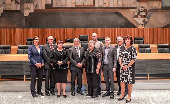 Anmerkung:Gruppenfoto der Landtagsdelegation aus Sachsen-Anhalt mit dem Südtiroler Landtagspräsidenten Josef Noggler (M.) im Plenarsaal des Landtags von Südtirol in Bozen. Foto: Noreen Neumann-Hagnbuchner