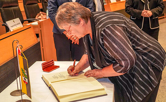 Anmerkung:Ausschussvorsitzende Monika Hohmann trägt sich ins Ehrenbuch des Landtags ein. Foto: Noreen Neumann-Hagnbuchner