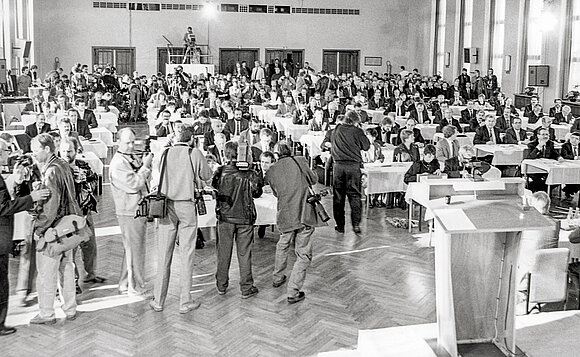 Anmerkung:Großes Pressegedränge im provisorischen Plenarsaal. Foto: Stadtarchiv-Dessau-Roßlau