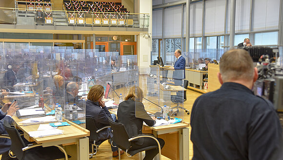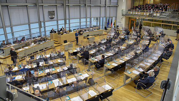 Der Landtag diskutierte, erstmals mit Plexiglaskabinen, über die aktuelle Corona-Situation im Land. Foto: Stefanie Böhme