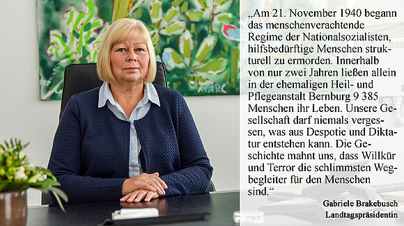 Bereits am 20. Januar 1940 wurden in Grafeneck (Baden-Württemberg) die ersten Aktion-T4-Tötungen in einer Gaskammer vorgenommen. „Am 21. November 1940 begann das menschenverachtende Regime der Nationalsozialisten damit, auch in Bernburg hilfsbedürftige Menschen strukturell zu ermorden“, erinnert Landtagspräsidentin Gabriele Brakebusch. „Innerhalb von nur zwei Jahren ließen in der ehemaligen Heil- und Pflegeanstalt Bernburg 9 384 Menschen mit Behinderung ihr Leben. Die heute als ‚Euthanasie‘ bekannte industrielle Tötung von Menschen, welche durch die Nationalsozialisten als ‚nicht lebenswert‘ gebrandmarkt wurden, ist ein dunkles Kapitel, auch in unserer Landesgeschichte“, so Brakebusch. „Dieses Kapitel birgt eine Verantwortung. Die Verantwortung, dass Hass, Missgunst, Gewalt und Ignoranz keinen Einzug in unsere demokratische Gesellschaft erhalten dürfen. Unsere Gesellschaft darf niemals vergessen, was aus Despotie und Diktatur entstehen kann. Die Geschichte mahnt uns, dass Willkür und Terror die schlimmsten Wegbegleiter für den Menschen sind.“