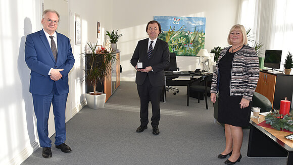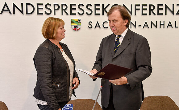 Landtagspräsidentin Gabriele Brakebusch und Ministerpräsident Dr. Reiner Haseloff verabschieden den langjährigen Landesbeauftragten für Datenschutz und Informationsfreiheit, Dr. Harald von Bose, in den Ruhestand. Foto: Stefanie Böhme