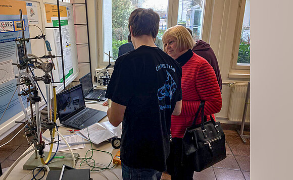 Anmerkung:Landtagspräsidentin Gabriele Brakebusch lässt sich von Teilnehmer/-innen beim Regionalwettberwerb „Jugend forscht“ in Halle (Saale) ihre Experimente und Projektideen erklären. Foto: Johannes Daehre/ Landtag von Sachsen-Anhalt