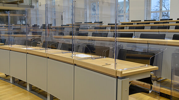Im Plenarsaal wurden die Sitzplätze der Abgeordneten mit Plexiglaskabinen ausgestattet. Foto: Stefan Müller (während des Aufbaus)