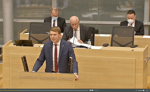 Anmerkung:Oliver Kirchner (AfD) während der Debatte zum Sachsen-Anhalt-Plan. Foto: Landtag/Screenshot