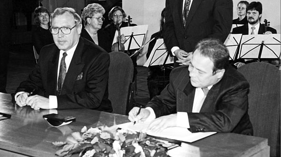 Landtagspräsident Dr. Klaus Keitel (r.) und Ministerpräsident Prof. Dr. Werner Münch bei der feierlichen Unterzeichnung der Verfassung für das Land Sachsen-Anhalt vor 25 Jahren. Foto: Landtagsarchiv