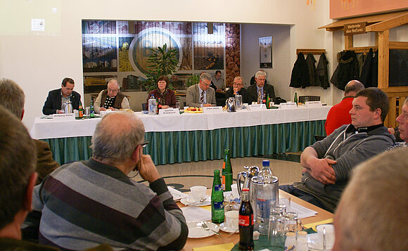 Anmerkung:Auch einige Landtagsabgeordnete und Landtagspräsidentin Gabriele Brakebusch (Podium Mitte) waren zum Schäferstammtisch gekommen, um sich über die Sorgen und Nöte der Schäfer zu informieren. Foto: Stefanie Böhme