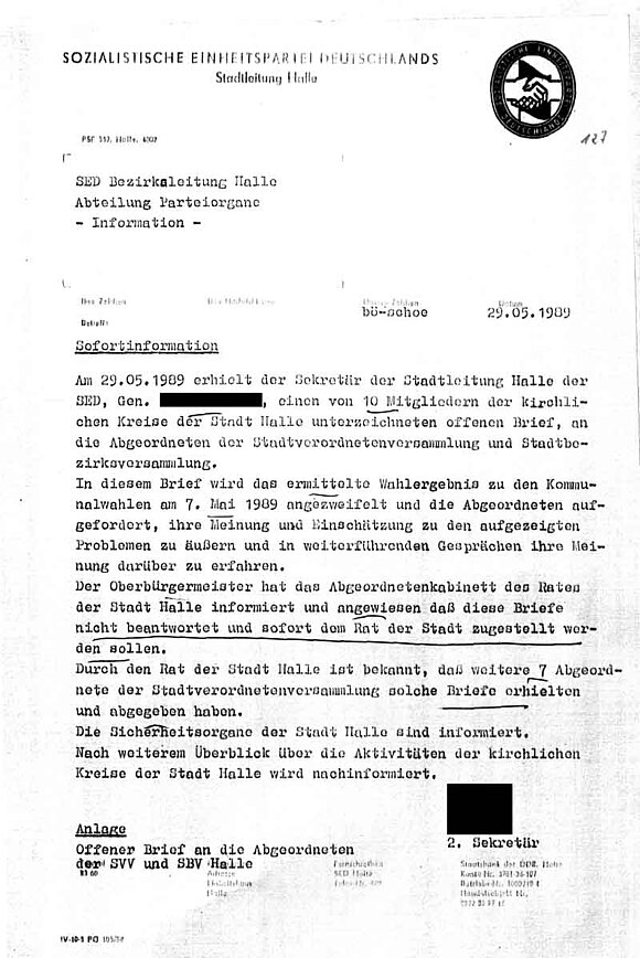 Der Protest zum offiziellen Ergebnis der Kommunalwahlen am 7. Mai 1989 ließen nicht lange auf sich warten. Die SED-Bezirksleitungen wurden von pflichtbewussten Kadern über die Protestschreiben informiert. Foto: LHASA