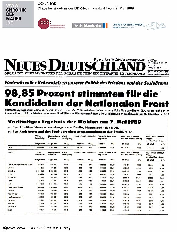 Doch die DDR-Führung hat die Rechnung ohne ihre Bürgerinnen und Bürger gemacht. Durch eine organisierte Kontrolle wurde eine Fälschung der Wahlergebnisse nachgewiesen. Offiziellen Angaben zufolge sollten 98,85 Prozent der Stimmen auf die Kandidaten der Nationalen Front gefallen sein. Dies war aber mitnichten der Fall.