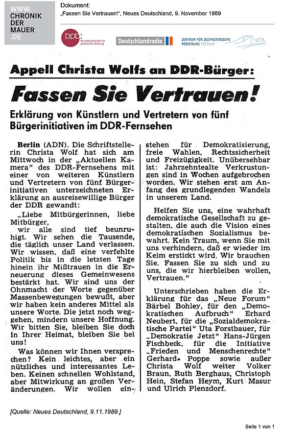 Schriftstellerin Christa Wolf forderte, wie viele andere Künstler der DDR, die Leute auf, in ihrer Heimat zu bleiben. Quelle: Neues Deutschland