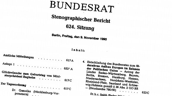 Titelblatt und Beginn des Inhaltsverzeichnisses der Sitzung des Bundesrats am 9. November 1990 in Berlin. Foto: Repro