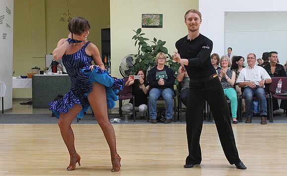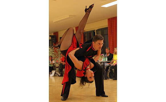 Anmerkung:Auch im Discofox ist man in Sachsen-Anhalt zu sehen. Seit 2009 ununterbrochen Ostdeutsche Meister sind Alexander Busch und Jette Schimmel (TC Schwarz-Silber Halle), die hier mir ihrer Kür zum Thema Carmen zu sehen sind. Mit dieser gewannen sie 2012 die Bronzemedaille auf der Discofox-Europameisterschaft in Tschechien und wurden 2013 Deutsche Vizemeister der Discofox-Kür. Foto: Erich Greiner