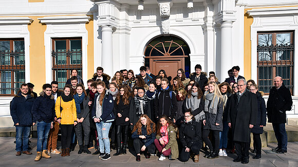 Die französisch-deutsche Schülergruppe traf sich zum obligatorischen Erinnerungsfoto vor dem Landtagsportal. Foto: Stefan Müller