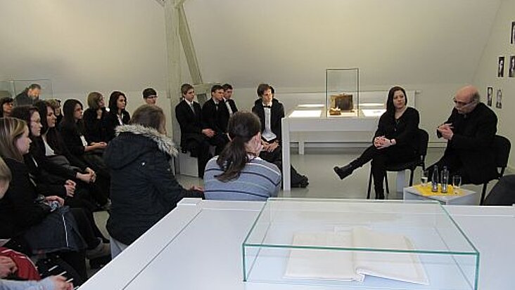 Die Schüler hatten im Rahmen einer Kooperation zwischen der Gedenkstätte und dem Gymnasium unterrichtsbegleitend eine szenische Lesung entwickelt, die sie dem Gast aus Israel präsentierten. Die szenische Lesung war den jüdischen Frauen gewidmet, die wegen ihrer (Liebes-)Beziehungen zu nicht-jüdischen Männern verfolgt wurden und im KZ Lichtenburg inhaftiert waren. Im Vorfeld hatten die Schülerinnen und Schüler verschiedene Quellen ausgewertet und diese dann zu einer szenischen Lesung verdichtet.