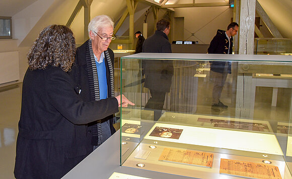 Anmerkung:Prof. Moshe Zimmermann, selbst Historiker, lässt sich von Gedenkstättenleiterin Melanie Engler durch die Ausstellungsräume der Gedenkstätte KZ Lichtenburg führen. Foto: Ulrich Grimm
