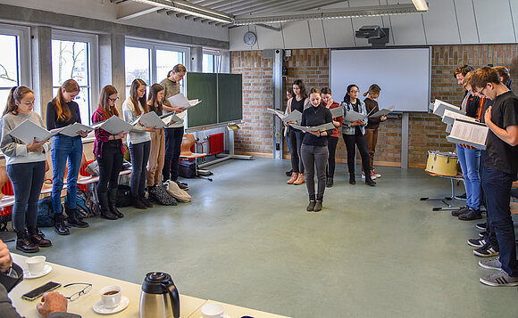 Anmerkung:Mit ihrer szenischen Lesung haben die Gymnasiasten aus Jessen Prof. Moshe Zimmermann sehr beeindruckt. Foto: Ulrich Grimm