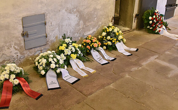 Anmerkung:Kränze anlässlich des Holocaustgedenktages 2020 vor dem Eingang der Gedenkstätte KZ Lichtenburg. Foto: Ulrich Grimm