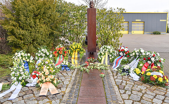 Anmerkung:Blumen und Kränze zum Zeichen der Erinnerung und Mahnung an die Opfer des Nationalsozialismus. Foto: Stefan Müller