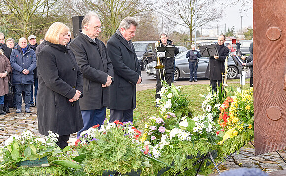 Zum Abschluss der Gedenkzeremonie riefen Oberkirchenrat Albrecht Steinhäuser (evangelische Kirche), Stefan Joseph Rether (katholische Kirche) und Rabbiner Motti Waitsman (jüdische Gemeinde) zum Gebet auf.