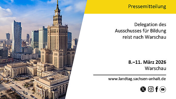 Eine Delegation des Ausschusses für Bildung des Landtags von Sachsen-Anhalt reiste vom 8. bis 11. März 2026 in die Republik Polen nach Warschau. Ziel der Reise war der fachliche Austausch zu aktuellen Herausforderungen und Chancen im Bildungsbereich in Hinblick auf die Digitalisierung im Schulwesen, Ansätze der digitalen Unterrichtsgestaltung sowie Strategien zur nachhaltigen Förderung digitaler Kompetenzen.