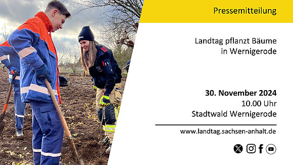 Nach der erfolgreichen Aktion am 23. November 2024 in Zeitz findet nun am Samstag, 30. November 2024, eine weitere öffentliche Pflanzaktion unter Beteiligung des Landtags von Sachsen-Anhalt statt. Dieses Mal geht es um die Aufforstung des kommunalen Stadtwalds Wernigerode. Der Landtag von Sachsen-Anhalt beteiligt sich an der Pflanzaktion mit 9000 Setzlingen. Vor allem Hain- und Rotbuchen werden in die Erde verpflanzt.