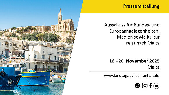 Der Ausschuss für Bundes- und Europaangelegenheiten, Medien sowie Kultur des Landtags von Sachsen-Anhalt reist vom 16. bis 20. November 2025 in Ausschussstärke in die Republik Malta. Die Schwerpunkte der Reise bilden insbesondere europa-, medien- und kulturpolitische Themen. Weiterhin soll die europäische Asylpolitik thematisiert werden.