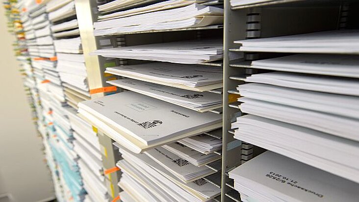 Im hauseigenen Archiv des Landtags werden die zahlreichen Unterlagen des parlamentarischen Betriebs – wie zum Beispiel die Originaldrucksachen und stenografischen Berichte – aufbewahrt.