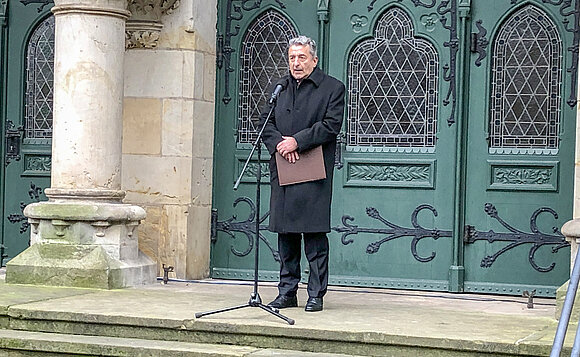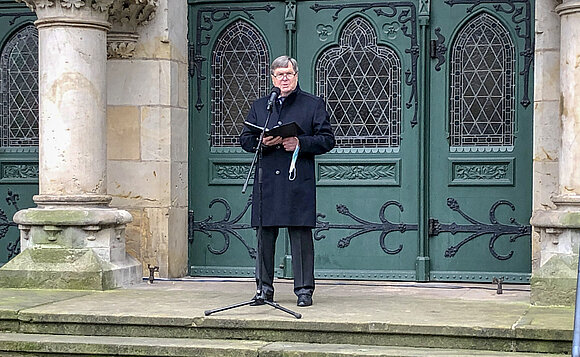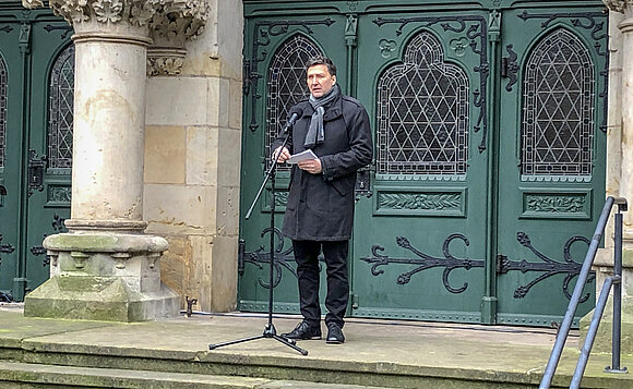 Stephan Hoenen, Superintendent des Evangelischen Kirchenkreises Magdeburg, rief dazu auf, sich an die Seite der Trauernden zu stellen. „Trauer braucht Trost“, so der Superintendent. Nach den mahnenden Worten sprach Landtagspräsident Dr. Gunnar Schellenberger das Totengedenken. Der sich anschließende Trauerzug steuerte auf die gemeinsame Kranzniederlegung zu.