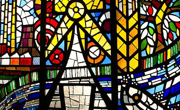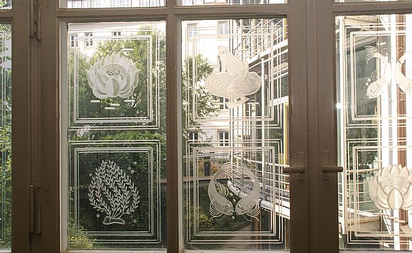 Anmerkung:A historical glass window with motives around the theme “water” created with glass etching technique. Photo: Stefanie Böhme