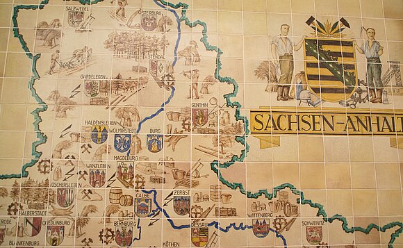 Anmerkung:The tiled wall painting shows a former map of Saxony-Anhalt within its borders of 1947 with amateur performances of the emblems of district capitals, as well as the symbols of industries and professions. Photo: Stefanie Böhme
