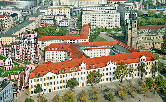 Der Landtag von Sachsen-Anhalt aus der Luft betrachtet. Links sieht man das Hundertwasserhaus, rechts das Kloster Unser Lieben Frauen. Foto: Werner Klapper