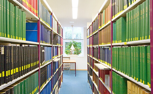 Anmerkung:Ein Blick durch die Bücherregale in der Landtagsbibliothek. Foto: Werner Klapper