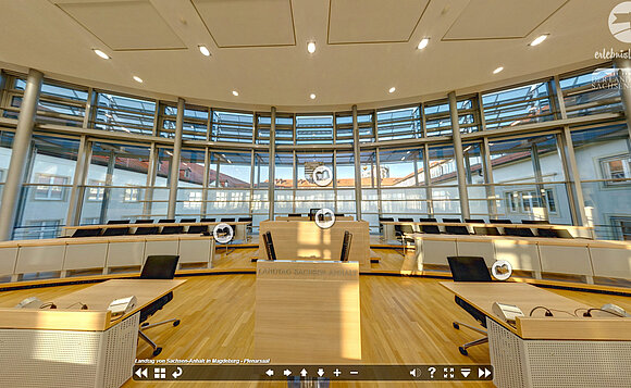 Anmerkung:Herzstück des Landtags und des virtuellen Rundgangs ist der Plenarsaal. Foto: erlebnisland.de