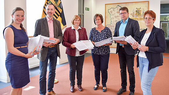 Am 13. September 2017 übergaben Vertrauensleute der Volksinitiative „Den Mangel beenden! – Unseren Kindern Zukunft geben!“ der damaligen Landtagspräsidentin Gabriele Brakebusch (3.v.l.) ihre Unterschriftenlisten: Thekla Mayerhofer, Sören Messerschmidt, Antje Thielebein, Thomas Jäger und Eva Gerth (v.l.n.r.). Foto: Stefan Müller
