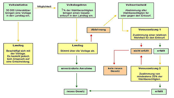 Wenn per Volksbegehren ein Gesetzentwurf in den Landtag eingebracht worden ist, dieser aber nicht innerhalb von vier Monaten unverändert vom Landtag angenommen wird, kommt es zum Volksentscheid. Das Volk kann sich also über das Votum des Landtags hinwegsetzen. Haben mindestens 25 Prozent aller Wahlberechtigten mit Ja gestimmt, ist der Gesetzentwurf angenommen. Indem mindestens ein Viertel der Wahlberechtigten für den Entwurf gestimmt hat, zeichnet sich eine Mindestakzeptanz für das Gesetz im Volk ab.