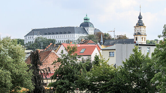 Blick auf Schloss Neu-Augustusburg, das Wahrzeichen von Weißenfels, rechts der Turm der Stadtkirche St. Marien. Foto: Gudrun Oelze