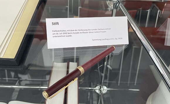 In diesem Jahr feiern wir das 30. Jubiäum der Verfassung des Landes Sachsen-Anhalt. Aus diesem Anlass hat der Landtag von Sachsen-Anhalt eine Kabinettausstellung erarbeitet. Zu sehen ist unter anderem die Gedenkplakette zur Ausfertigung und Verkündung der Verfassung, unterzeichnet vom damaligen Landtagspräsidenten Dr. Klaus Keitel, ebenso der Füllfederhalter, mit dem die Verfassung des Landes Sachsen-Anhalt im Kloster Unser Lieben Frauen in Magdeburg unterzeichnet wurde. Außerdem können Sie verschiedene Programmhefte zu Verfassungsjubiläen im Spiegel der Zeit entdecken und erhalten Einblick die fachgerechte Aufbewahrung der Landesverfassung im Landtagsarchiv. Zeitungsartikel aus dem Jahr 1992 runden die Kabinettausstellung ab.